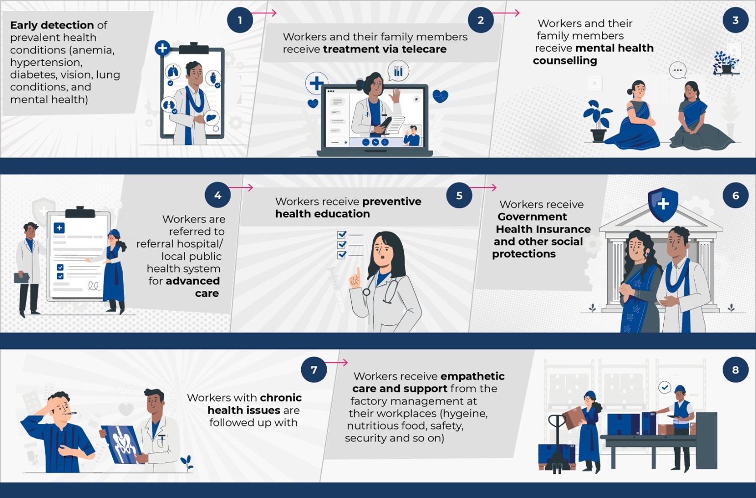 Empowering millions of impoverished factory workers, predominantly women, to access essential healthcare remains an urgent imperative. The barriers factors of extended working hours, limited access, and domestic responsibilities have rendered public health services elusive, while private alternatives remain financially out of reach.